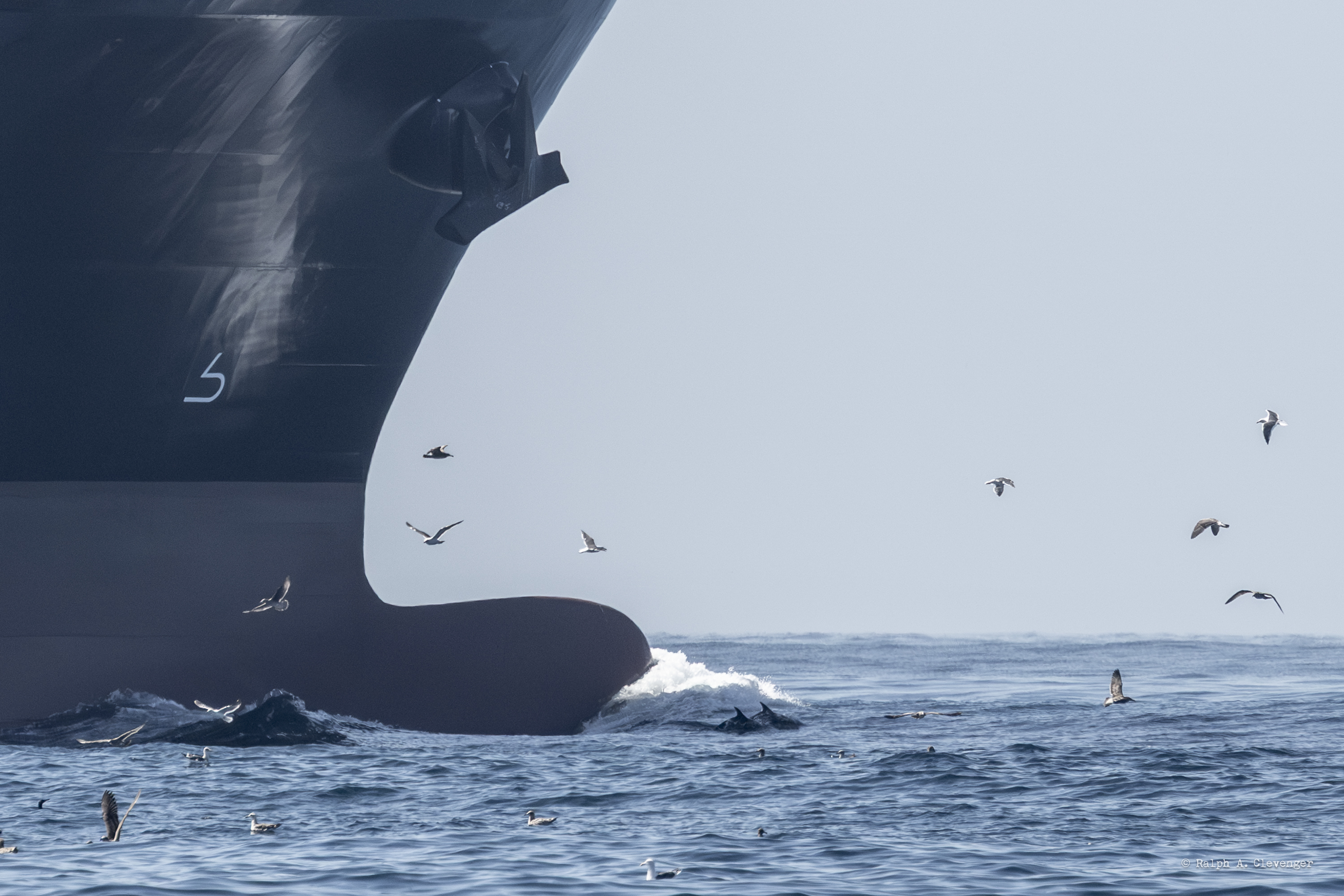 Photo Credit: Ralph A. Clevenger; Dolphins swim in the bow wave of a large shipping vessel in the Santa Barbara Channel, October 2025