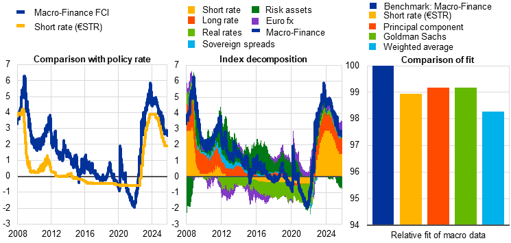 Notes: The left panel plots the Macro-Finance FCI alongside the €STR. The middle panel shows the index and its decomposition, with contributions estimated in a macro-finance model (Bletzinger, T. et al., forthcoming). The “Short rate” refers to the €STR, the “Long rate” to the ten-year nominal OIS rate, “Real rates” to the one-year real OIS rate in one year’s time and the five-year real OIS rate, “Sov. spreads” to the two- and ten-year euro area GDP-weighted sovereign bond spreads over OIS rates, “Risk assets” to investment-grade corporate bond spreads and the CAPE ratio, and “Euro fx” to the NEER of the euro. The right panel compares the joint fit of euro area HICP inflation and the composite PMI when substituting the index with other measures in the model. The fit of the Macro-Finance FCI is normalised to 100, and the fit of the other models is expressed relative to that benchmark. The Goldman Sachs FCI refers to Stehn et al. (2019) and the weighted average FCI to Arrigoni et al. (2020). The principal component is the statistical factor that explains most of the variation among the financial market variables entering the Macro-Finance FCI.