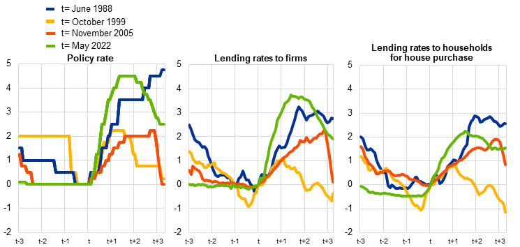 Notes: The ECB relevant policy rate is the lombard rate up to December 1998, the MRO up to May 2014 and the DFR thereafter. The chart reports differences with respect to June 1988, October 1999, November 2005, May 2022 in each of the two panels. Dates are selected as the first change in policy rates in a hiking cycle.