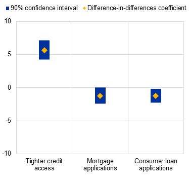 Notes: Left panel: the chart shows coefficients from a difference-in-difference regression of expectations of credit market access and applications of households on an indicator for whether the household reported that its financial wellbeing would be negatively affected by US tariffs interacted with a dummy for the period April 2025 to July 2025. Right panel: the chart shows the share of CES respondents reporting difficulties meeting mortgage payments in the past 12 months, by income quintile. Income quintiles are computed over the weighted distribution of the variable at the country level and by wave.