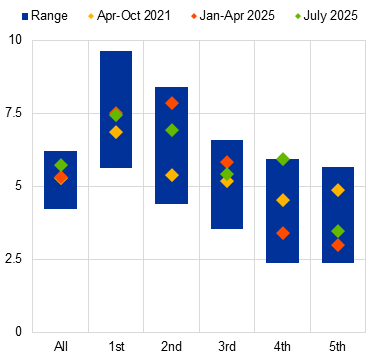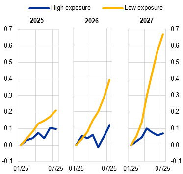 The recent tariff agreement between the EU and the United States has eased trade policy uncertainty and overall economic policy uncertainty to some extent, yet important questions remain. A key source of risk is the ongoing tensions in US-China trade relations. If these tensions persist, Chinese exporters would have stronger incentives to redirect shipments toward non‑US markets, heightening competition for European firms.[25] Such increased competition would weigh on demand in export-intensive and import-competing European sectors, reducing corporate earnings and weakening the transmission of monetary easing through the cash flow and balance sheet channels. In addition to these demand-side effects, trade tensions may disrupt supply chains, amplifying the risk faced by banks in lending to firms participating in international trade and thus amplifying conditions of uncertainty.[26]