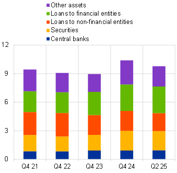 Exposures on the asset side can be sizeable. Total USD exposures represented almost 10 per cent of the assets of the euro area banking system in the second quarter of 2025.[36] Among the banks with USD asset exposures, the interquartile range of the ratio of these exposures over total assets lies between 5 per cent and 25 per cent as at the second quarter of 2025, with around one half of the overall exposures accounted for by loans of banking groups active outside of the euro area (Chart 11, Panel A). In general, the valuation impact is relatively contained when cast against the capital buffers of the euro area banking system or previous episodes of valuation losses associated with, for instance, fluctuations in the value of sovereign holdings.