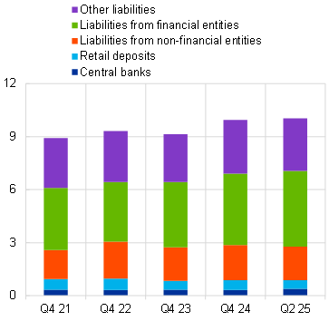 Moreover, euro area banks also have a substantial part of liabilities denominated in USD, with an interquartile range ranging between 7 per cent and 28 per cent as at the second quarter of 2025, and with a total amount similar to that of assets. A substantial share (43 per cent) of USD-denominated liabilities is provided by financial entities (Chart 11, panel B) and is therefore relatively volatile, especially during market turbulence. Overall, the net exposure in USD is rather stable over time: for banks with USD exposures, it is close to zero for the median bank and slightly negative in the aggregate at -2 per cent of banks’ assets. Moreover, reflecting the asset-liability management practices and the business models of banks with significant USD activity, net exposures are typically relatively unreactive to fluctuations in the exchange rate, policy rates or the business cycle. At the same time, the combined presence of substantial USD-denominated off-balance sheet exposures and volatile funding means that sudden changes in these net exposures cannot be ruled out. An increased probability of such a risk event would then generate pressures on both sides of banks’ balance sheets and potentially downward pressure on on-balance sheet exposures like loans to the real economy.[37] Moreover, the composition of USD liabilities, dominated by funding from financial customers and with a limited share of retail deposits, can exacerbate these pressures by making funding more flight‑prone, thereby increasing vulnerability in a stress scenario.