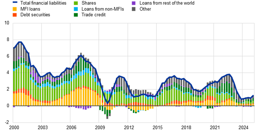 Looking in more detail at the sources of external financing for firms other than borrowing from banks, corporate bond issuance has benefited from foreign inflows into euro area bond funds in recent quarters, amid a shift in investor cross-border funds in favour of the euro area. Non-listed equities have also increased recently, likely reflecting activities of private equity funds. One segment of non-bank financing that has been growing significantly in recent years is private credit. Private credit generally refers to non-bank corporate credit provided through bilateral agreements or small “club deals” involving lenders outside the realm of securities investors or commercial banks. Despite a clear expansion in the euro area over recent years, the lion’s share of private credit is originated in the United States.[9] Although numbers vary depending on the exact definition of private credit and source, the size of private credit in the United States is well above €1 trillion, while for the euro area numbers range from around €100 billion to around €300 billion.[10] Taken together, non-bank financing has not grown enough to counteract the weakness in bank lending. The dynamics of all the sources of external finance for euro area firms, including equity financing, but also trade credit and non-bank financing, remain contained by historical standards (Chart 4), hence overall measures of the credit gap, as shown in Chart 3, remain negative.