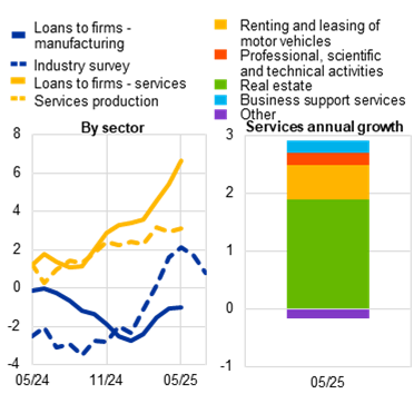 For instance, the growth rate of loans to the manufacturing sector, although recently supported by the surge in activity due to frontloading of euro area shipments to the United States, has been weaker than that of loans to the services sector (Chart 5, Panel A).[12] As manufacturing is capital-intensive, this development connects to the anaemic growth in investment in recent years. Moreover, manufacturing is also working-capital intensive, and therefore especially affected by the cost channel of monetary policy. That a stronger recovery in the manufacturing sector has so far not materialised helps explain a weaker pass‑through of monetary easing via the cost channel than would normally be expected. The underlying reasons could be related to the greater exposure of manufacturing to the external environment, a topic that I will get back to later. By contrast, credit dynamics in the services sector have been driven largely by real estate and leasing activities, supported by recovering domestic demand for housing and durable goods in the euro area.