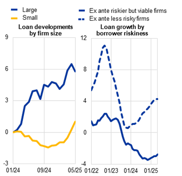 At the firm level, credit growth is increasingly concentrated among larger and less risky firms (Chart 5, panel B). Results from the survey on the access to finance of enterprises (SAFE) confirm that small firms have experienced a more muted decline in external financing costs than larger producers. This points to contained transmission via the balance sheet channel and the risk-taking channel of monetary policy. Smaller firms, being more vulnerable to current macroeconomic risks, have therefore suffered sharper balance sheet losses. At the same time, banks have been more reluctant to extend credit to riskier borrowers.[13] Since small firms also face greater obstacles in accessing alternative sources of funding, banks’ reluctance to lend further tightens the financial constraints facing smaller and riskier firms and weighs on their ability to invest.[14]