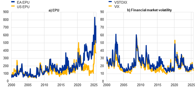 An important factor that may distort and at times suppress the transmission of monetary policy is uncertainty. Over the past year, economic policy uncertainty has risen sharply, reaching record levels in April, largely driven by trade tensions and geopolitical risks (Chart 7, left panel). Financial market volatility has, instead, remained subdued (Chart 7, right panel). While uncertainty has eased somewhat in recent months, it remains at historically high levels on both sides of the Atlantic according to newspaper-based measures, close to the peak seen during the COVID-19 pandemic.